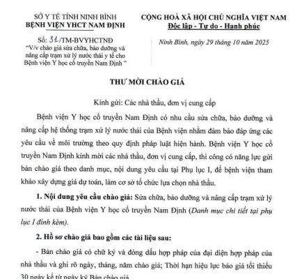 V/v: Chào giá sửa chữa, bảo dưỡng và nâng cấp trạm xử lý nước thải y tế cho Bệnh viện Y học cổ truyền Nam Định