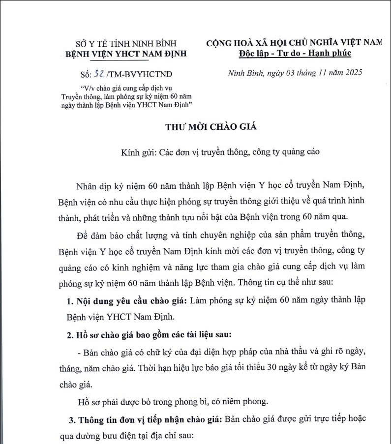 V/v chào giá cung cấp dịch vụ Truyền thông, làm phóng sự kỷ niệm 60 năm ngày thành lập Bệnh viện Y học cổ truyền Nam Định