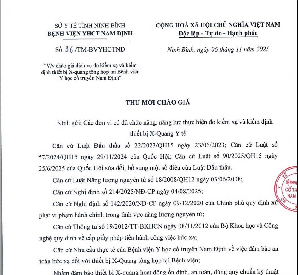 V/v chào giá dịch vụ đo kiểm xạ và kiểm định thiết bị X-Quang tổng hợp tại Bệnh viện Y học cổ truyền Nam Định
