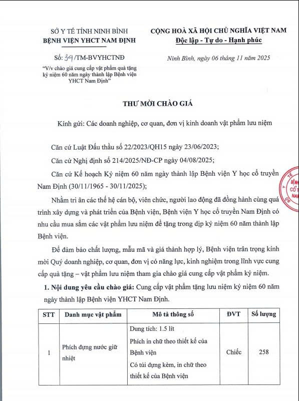 V/v Chào giá cung cấp vật phẩm quà tặng kỷ niệm 60 năm ngày thành lập Bệnh viện YHCT Nam Định