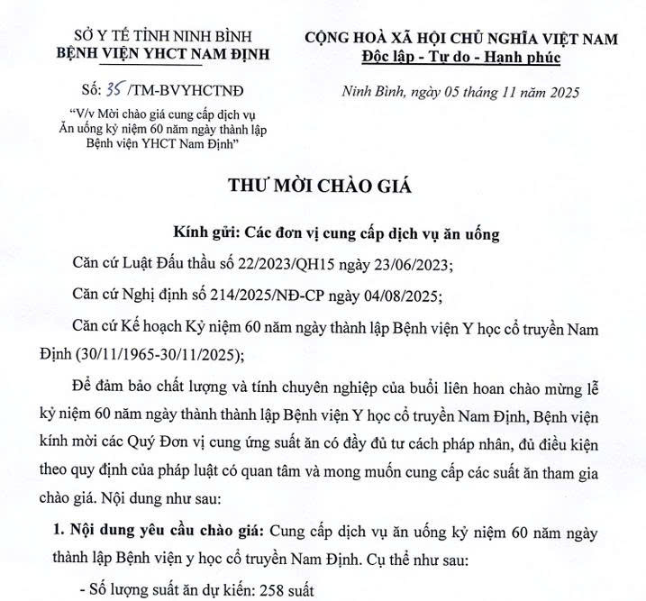 V/v: Mời chào giá cung cấp dịch vụ ăn uống kỷ niệm 60 năm ngày thành lập Bệnh viện YHCT Nam Định