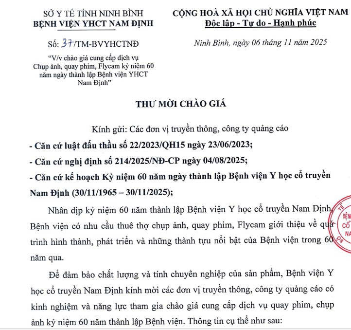 V/v: Chào giá cung cấp dịch vụ chụp ảnh, quay phim, flycam kỷ niệm 60 năm ngày thành lập Bệnh viện YHCT Nam Định